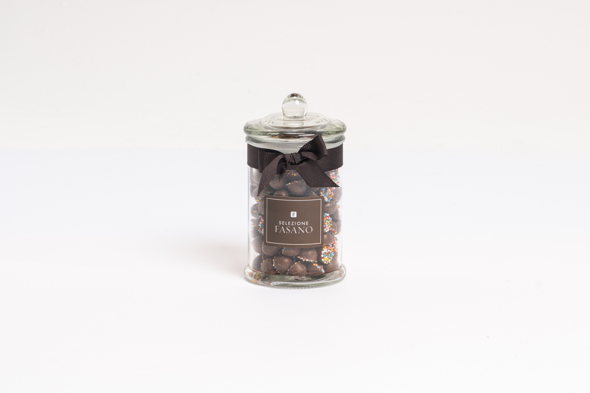 Chocolate ao leite cremoso, coberto por confeitos crocantes e coloridos.