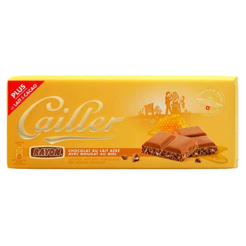 Chocolate ao leite com nougat de mel. Vem da Suíça em embalagem de papel com 100g.