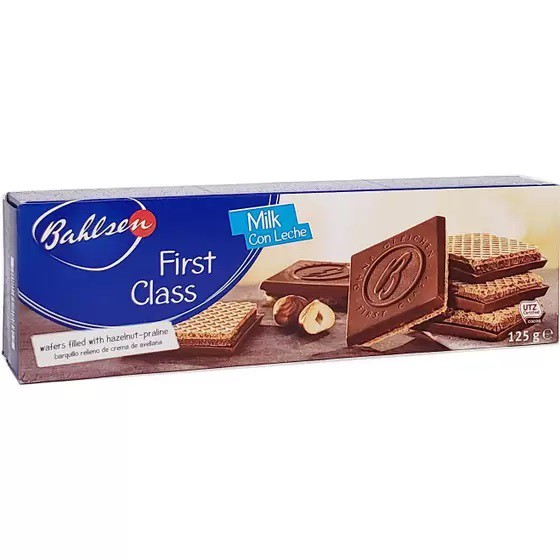 Creme de avelã entre dois waffles, coberto com um pedacinho de chocolate ao leite. Avelãs torradas e finamente moídas. A Bahlsen trabalha com parceiros comprometidos com métodos agrícolas sustentáveis.