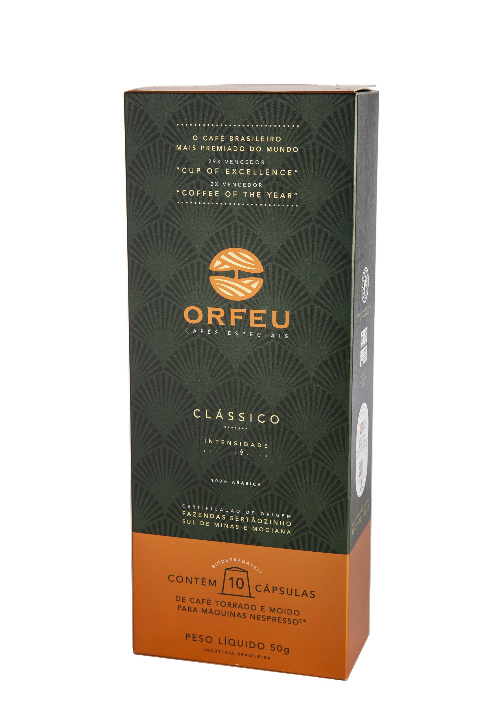 Orfeu Clássico em cápsulas é um café 100% Arábica, equilibrado e de torra média. Apresenta notas florais, frutadas e de caramelo. Possui doçura alta, acidez equilibrada, corpo aveludado e aromas complexos, com uma finalização persistente e prazerosa. Sua intensidade é equivalente a 6. E a dosagem indicada para um espresso é de 40ml.