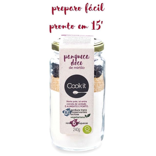 Panquecas com Mirtilos para a refeição mais importante do dia? Parece impossível, mas não é! Dentro de nossos charmosos vidros estão todos os ingredientes secos — muito mirtilo — para prepará-las. Basta acrescentar leite, ovos e manteiga e assar por alguns minutos. Seu café da manhã nunca mais será o mesmo! Sirva com mel, xarope de bordo ou geleia de sua preferência.